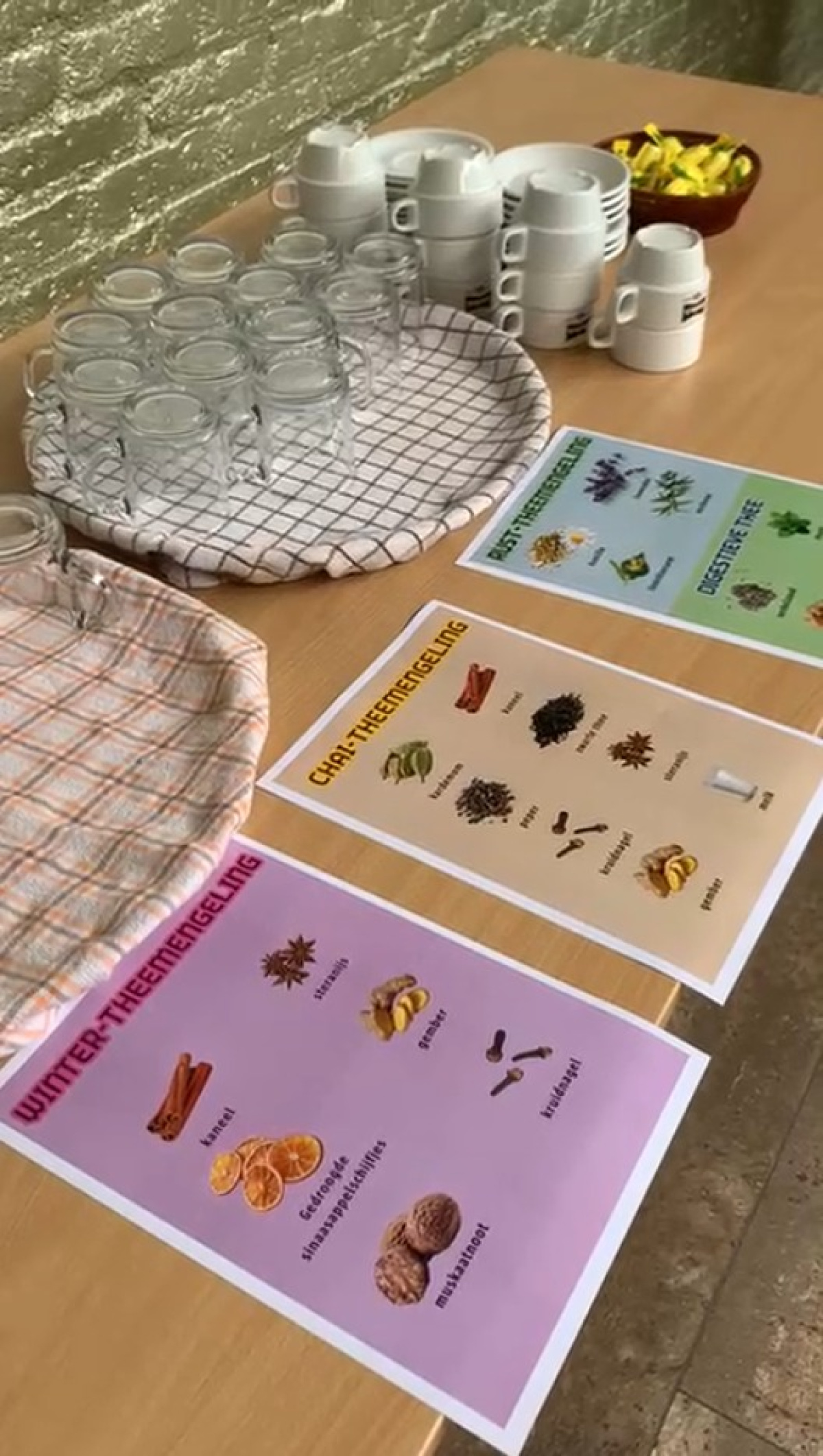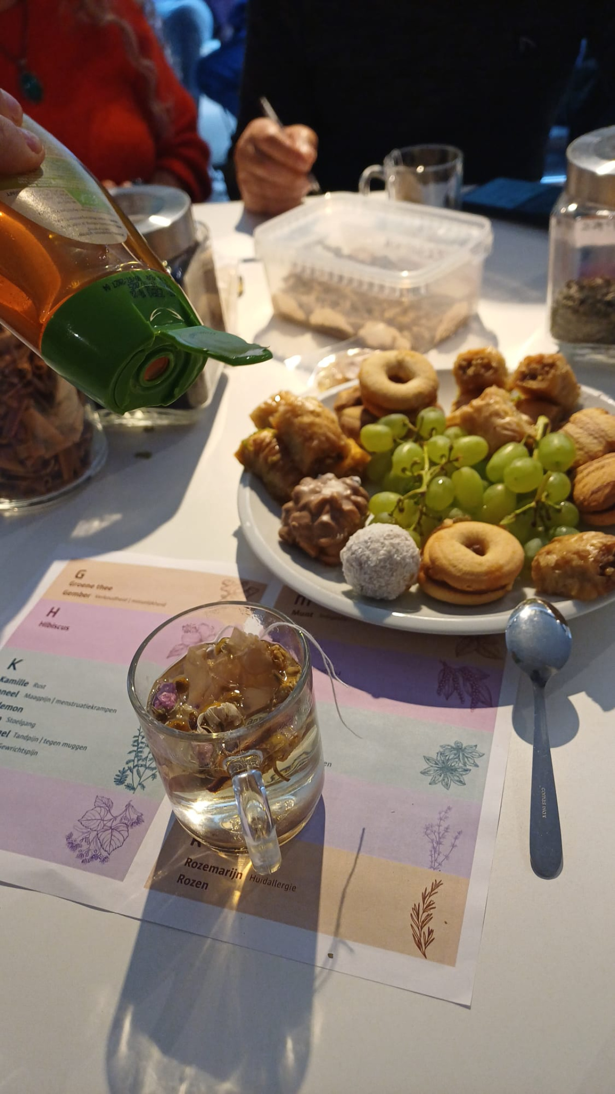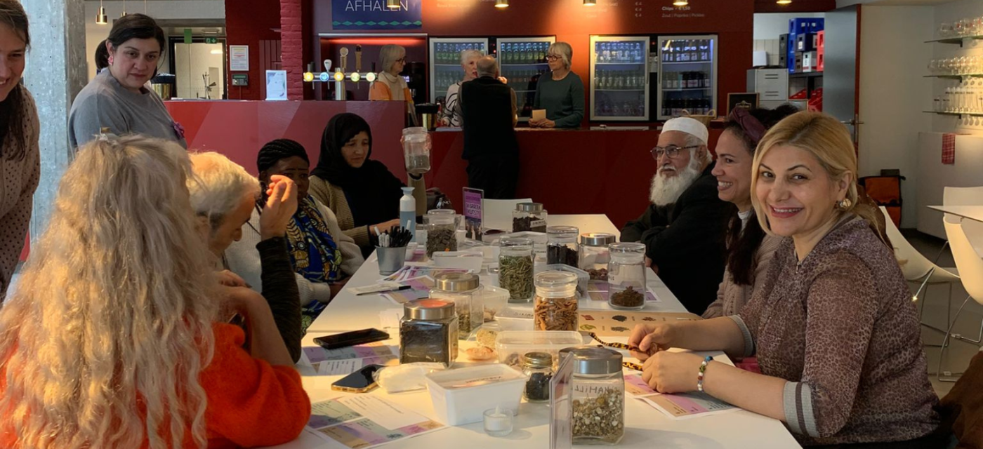 Publiekswerkers Laura en Zahra ontvingen de deelnemers met een workshop thee. Met lekkere koekjes gingen ze samen in gesprek over het gebruik van kruiden in ieders land van herkomst. Van kurkuma om vlees mee te koken, tot gember tegen hoest en anijs voor in likeur. Een ideale manier om bij te leren van elkaar! Alle gebruiken bundelden ze in een gedeeld kruidenboek.